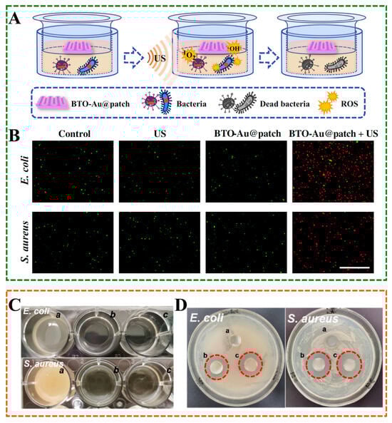 Infection is the leading cause of delayed postoperative repair and wound healing, which brings both physical and mental harm to patients and increases the economic burden. Huang et al. used an extrusion 3D printer to develop a Janus piezoelectric patch. The top layer of the patch is poly(ethylene glycol) diacrylate (PEGDA) loaded with piezoelectric nanocomposite material, which plays a sonodynamic antibacterial effect, and the bottom layer is methacrylate gelatin (GelMA) loaded with vascular endothelial growth factor (VEGF), which can accelerate wound healing (Figure 7A,B) []. Chronic diabetic wounds are extremely difficult to heal due to high inflammation, high oxidative stress, and a high-sugar environment []. Among them, the high-sugar microenvironment makes the wound susceptible to bacterial infection. Antibiotics remain the most effective treatment, but their abuse can further exacerbate the production of bacterial resistance. Although many antibacterial hydrogels have been reported, an ideal dressing for treating chronic wounds remains a significant challenge. Liu et al. developed a smart antibacterial drug release SBMA/HA-GS/CS (SHGC) Janus wound dressing for diabetic wound healing, which can effectively kill Escherichia coli (E. coli) and Staphylococcus aureus (S. aurues). (Figure 7C,D) []. In this dressing, the combination of HA-GS (hyaluronic acid is grafted with gentamicin sulfate) and zwitterionic polymers (SBMA) can prevent bacterial and protein adhesion, chitosan (CS) is applied on one side of the hydrogel to improve the adhesion to the skin tissue, and an antibacterial hydrogel wound dressing can be obtained. The dual antibacterial strategy, combining physical anti-fouling and chemical sterilization, works together to reduce the risk of infection.