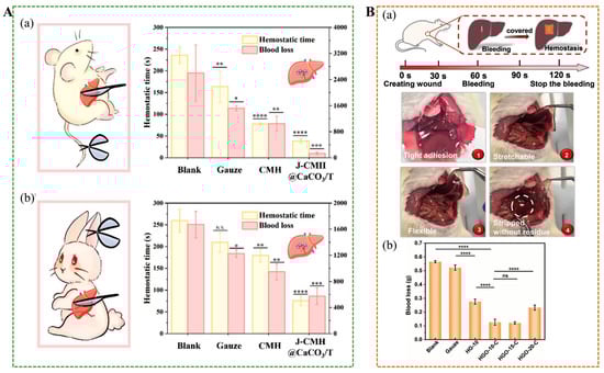 (A) (a) Hemostatic time of hepatic hemorrhage was treated with different samples in rat hepatic hemorrhage model. (b) Hemostatic time of hepatic hemorrhage was treated with different samples in rabbit hepatic hemorrhage model []. (B) (a) Hemostatic results of hydrogel applied to the rat liver injury model. (b) Quantitative blood loss of rats treated with gauze and HGO-C Janus hydrogels. * p < 0.05, ** p < 0.01, *** p < 0.001, **** p < 0.0001, ns for no significant differences [].