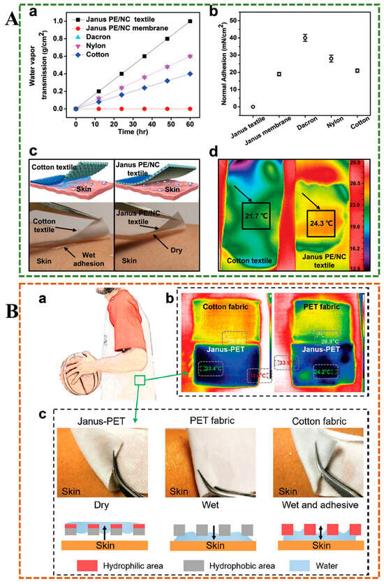 Moisture management is one of the most vital criteria for evaluating functional textiles. Excessive sweat produced by the skin can cause uncomfortable sensations, such as feeling sticky and cold. Cotton fabrics have the ability to absorb sweat but cannot achieve efficient delivery of sweat, resulting in water accumulation. Dai et al. have developed a textile with both hydrophobic (polyester, PE) and superhydrophobic (nitrocellulose, NC) asymmetrically porous structures through laser drilling, maintaining the water absorption and air permeability of traditional fabrics, with a directional water transport capacity of up to 1246%, preventing the stickiness and cold caused by excessive sweat (Figure 12A) []. Miao et al. designed a three-layer PU/(PU-HPAN)/HPAN fiber film, which had progressive wettability characteristics, enabling the fiber film to carry out water transport spontaneously, continuously, and in a directional manner, and prevent penetration in the reverse direction, can be used in the textile field to bring dry and comfortable experience to the wearer []. However, these studies focused on the directed delivery of water, ignoring the bacterial growth caused by sweat, which can further lead to skin and other diseases. Wang et al. used a simple dip-pad-cure method to design a Janus poly(ethylene terephthalate) (PET) fabric treated with cation-π hydrophilic agent (CPHA) on one side, which had a unidirectional water transport capacity of 1115%, maintained skin dry and comfortable, and also had good antibacterial properties (Figure 12B) []. As a novel functional textile, it not only solves the problem of moisture management but also considers human health and hygiene, which has excellent potential for application. Janus fabrics are easily damaged during use and cannot withstand multiple home washes, which affects their one-way water transport capacity. Zhou et al. employed a simple and rapid thermal transfer/laser method to produce Janus fabric with exceptional moisture management capabilities, which can withstand over 900 friction cycles and 250 household laundry cycles, exhibiting good durability [].