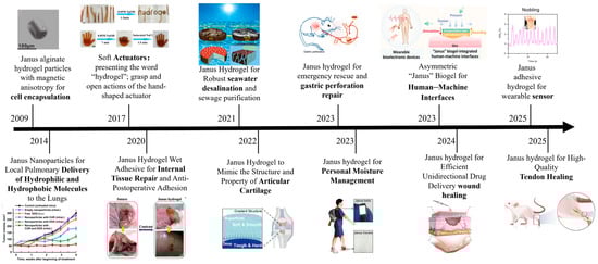 Exploring Janus hydrogels has opened new avenues in material science, particularly in biomedical applications and environmental sustainability. Scheme 1 shows the development of Janus hydrogel applications in various fields. By possessing two distinct functionalities on different sides, Janus hydrogels can be engineered to perform complex tasks that traditional, uniform hydrogels cannot achieve. This duality enhances their utility and significantly impacts their design and application. As we delve deeper into the advancements in Janus hydrogels, it is crucial to examine the methodologies employed in their fabrication. Recent studies have highlighted various approaches, including microfluidic techniques, phase separation methods, and photopolymerization [,]. Each method offers unique advantages, including precise control over material properties and scalability for industrial applications. For instance, microfluidic techniques enable the generation of Janus hydrogels with nanoscale precision, allowing researchers to fine-tune the surface chemistry for specific interactions []. This level of control can lead to the development of hydrogels that selectively interact with specific biological environments, such as tumor tissues, thereby enhancing drug delivery systems [].