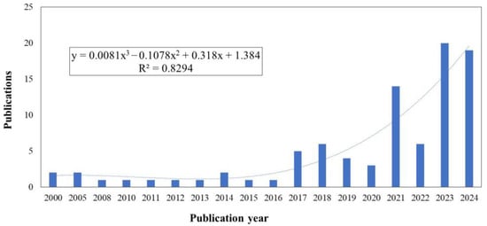 Grounded in the study’s scope—encompassing both large-scale production systems and small-scale contexts such as urban agriculture, and emphasizing hydrogels in association with nutrients, agrochemicals, active agents, and biostimulants within Integrated Crop Management (ICM) strategies—the results are structured to first provide a macro-level assessment of research evolution, followed by a micro-level analysis of individual contributions. This structure, enabled by the combined application of the Preferred Reporting Items for Systematic Reviews and Meta-Analyses (PRISMA) methodology and bibliometric analysis, provides a comprehensive framework for identifying publication trends, thematic clusters, and research gaps. The macro-level overview begins with an examination of publication growth patterns over time, offering context for subsequent in-depth analysis at the document level. As shown in Figure 1, the documents analyzed in this work cover the years 2000 to 2024. The earliest publications include to the works of the Saraydın et al. (2000) [27] which focused on the use of the hydrogel in pest control by evaluating the controlled release of the water-soluble agrochemical herbicide such as sodium 2,2 dichloropropionate (Dowpon). In the same year, Karadağ et al. (2000) [28] explored applications in crop nutrition by the analysis of the interaction between the hydrogel and fertilizers such as ammonium nitrate, potassium nitrate and ammonium sulfate. They also evaluated the potential for the pest control of the grasses and weeds using Dalapon. Both studies employed the same type of the pest control approach, involve the same active compound, and utilized hydrogels are based on acrylamide.
