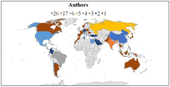 Figure 1 illustrates the steady increase in publications on this topic, with 2023 representing the most active year. The growth trend was modeled using a cubic polynomial regression (y = 0.0081x3 − 0.1078x2 + 0.318x + 1.384), which yielded an R2 value of 0.8294. In the physical sciences and engineering disciplines, R2 values above 0.70 are generally regarded as acceptable indicators of fit, providing meaningful descriptive insight into data trends [29]. Although this model is not intended as a predictive tool, it effectively summarizes the observed growth—particularly between 2020 and 2023—and suggests that publication activity in this field is likely to continue increasing over the next five years. This macro-level overview sets the stage for the detailed bibliometric analysis that follows, which integrates both macro- and micro-level perspectives to identify key institutions, leading authors, and thematic keyword patterns shaping research in this domain.