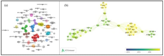 Authorship analysis: (a) distribution of authors; (b) collaboration networks among authors. Elaborated using VOSviewer.