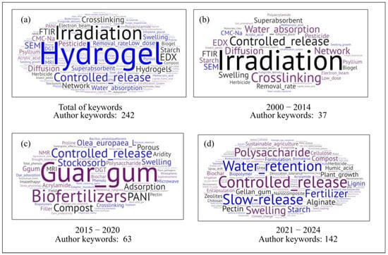 Figure 5b–d depict the temporal evolution of the contextual focus. To improve the interpretability of this analysis, the term hydrogel was excluded. Although the number of words increased, it was possible to observe the inclusion of more bio-based components during the period 2015–2020, such as Guar gum (Figure 5c), or the starch or other polysaccharides (Figure 5d). As shown Figure 5b–d, there is clear evidence of an evolution in applications. For instance, in the most recent works (Figure 5d) the keywords include terms such as “sustainable agriculture” [52]. In this same period the use of natural polymers is remarkable in order to produce more eco-friendly materials [53,54,55].