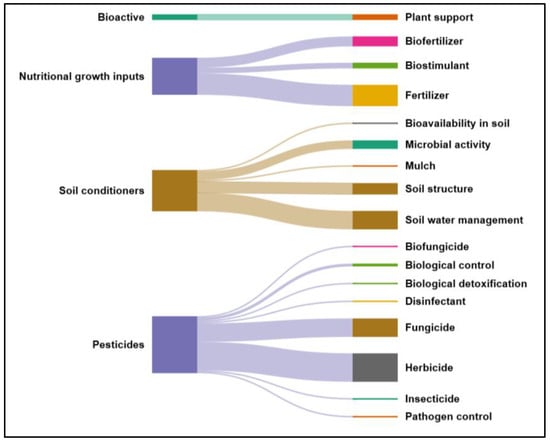 From Figure 5, author keywords highlight applications related to ICM practices, such as water retention for soil improvement and the use of biofertilizers and fertilizers, even when not explicitly stated. The preceding analyses provide the contextual foundation for a more detailed examination of hydrogel applications, which are classified into four categories: bioactive products, nutritional growth inputs, pesticides, and soil conditioners (Figure 6). The Sankey diagram illustrates their distribution, with most publications addressing pesticides, followed by soil conditioners, and fewer on bioactive products, which enhance plant tissue growth and support controlled bioactive release [58]. Six studies were classified into more than one category.