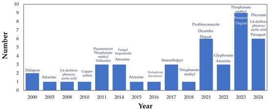 Figure 7 illustrates the evolution of the pesticides examined by the authors. Despite this trend, highly toxic substances such as paraquat and copper sulfate continue to be referenced in certain documents—likely due to their increasing use, particularly paraquat in 2024, given its high efficacy in weed control [64]. Novel hydrogel-based systems have been reported, including the study conducted by Dong et al. (2023) [53], which produced a metal–organic framework (MOF) nanoparticle synthesized from FeCl3 and 2-aminoterephthalic acid to address challenges associated with its application. The hydrogel material contains mesoporous crystalline cages that functioned as carriers for herbicide encapsulation. Additional studies have investigated nanocomposites—comprising methylcellulose or chitosan reinforced with zeolite and further enhanced by poly(methacrylic acid)-co-polyacrylamide—to mitigate or diminish the leakage of hazardous compounds, even under fluctuating pH circumstances. [56].