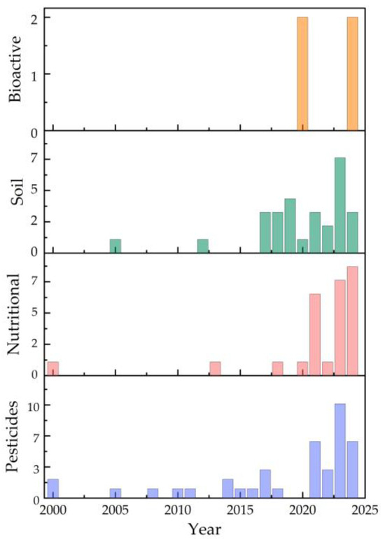 Figure 8 and Table S2 show that a considerable number of hydrogels have been developed, mirroring observations made in the context of pesticides. Figure 9b depicts a specific evolution in the types of polymers utilized for the incorporation of nutritional growth inputs. Between 2000 and 2013, the materials identified predominantly comprised synthetic hydrogels with limited functionality and bio-integration, including acrylamide/crotonic acid [28]. During the subsequent period, as illustrated in Figure 9b and Figure 12, the utilization of commercial hydrogels, including Stockosorb, rose markedly. This material demonstrates benefits in alleviating drought stress in the production of olive plantlets [2]. In this timeframe, biocomposites derived from bacterial nanocellulose were also observed [22]. The latest period examined in this study, extending from 2021 to 2024, underscores the growing application of bio-based hydrogels incorporating components sourced from waste valorization, such as hydrogels derived from rice-cooked wastewater [45].