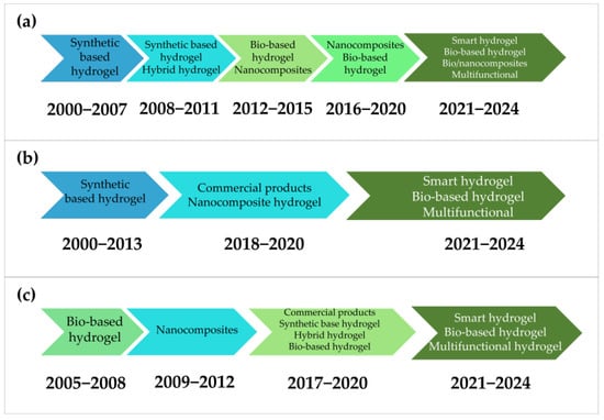 A notable trend is the increasing investigation of hydrogels derived from composites and biocomposites. In summary, regarding the types of materials, as illustrated in Figure 8 and Figure 9a, this diversity can be categorized as synthetic polymers [76,77], bio-based polymers. Some of these materials are further classified as smart hydrogels due to their ability to respond to external stimuli such as variations in pH or controlled water retention and release [57]. However, in the most recent period examined in this study, certain hydrogels have been considered as multifunctional, owing to the incorporation of diverse components and their capacity to support and adapt to multiple environmental stimuli. These functions include water absorbency at different pH, temperature, and light levels [78], as well as the controlled release of compounds from microbeads, for example, those based on Ca-alginate graft copolymer of poly[N-isopropyl acrylamide-co-N,N-diethylacrylamide] [79].