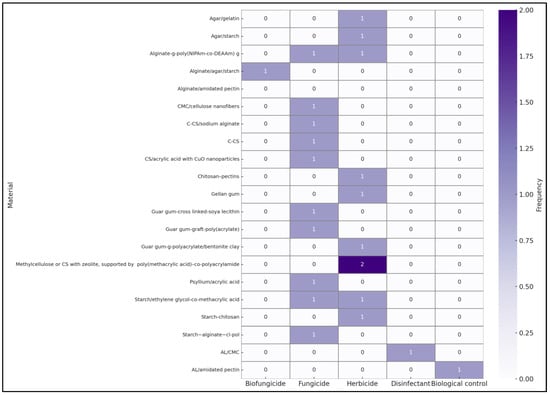 Document frequency linking bio-based hydrogels with pesticide categories. Values denote the number of studies reporting each case. Prepared with the assistance of artificial intelligence (ChatGPT, OpenAI, 2025), based on data and instructions provided by the authors.