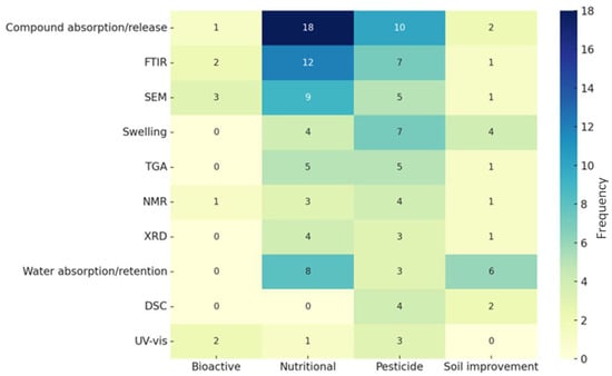 Figure 11 illustrates that the main techniques employed to characterize hydrogels for nutritional growth inputs concentrate on compound absorption and release, encompassing release profiles in both water [3,35,50,91,97] and soil [3,20,89,91,97]. As previously discussed regarding pesticide-related hydrogels, structural characterization methods such as FTIR [8,22,35,50,68,81,89,90,91,94,95,98], SEM [9,22,35,50,68,81,89,91,93,94,95,98], and TGA [20,22,45,81,89,91,95,98] are also significantly utilized. Furthermore, evaluations of water absorption and retention capacity are significant for assessing the material’s agricultural performance. The application of these techniques reflects a strong scholarly interest in analyzing or understanding nutrient delivery and availability. The capacity for entrapment of fertilizers, like pesticides, is frequently assessed using UV–visible spectrophotometry [32,90,91,96].