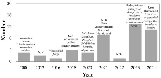 The growing variety of fertilizer-related compounds reflects a trend similar to that seen in pesticide applications. Figure 12 shows a significant increase in the diversity of compounds reported in the reviewed documents. Urea remains the most frequently cited substance [20,32,45,50,81,89,90], primarily due to its widespread use as a fertilizer, its high nitrogen content, and low cost. However, nutrient losses and runoff in agricultural systems presents a significant challenge [50].