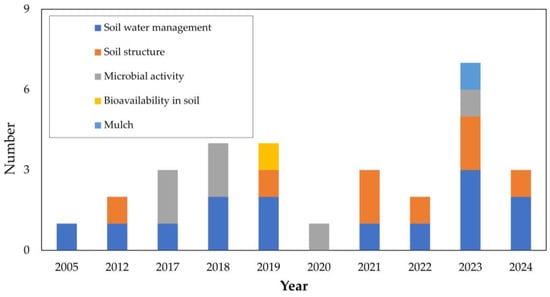 Figure 13 highlights that soil water management consistently emerges as a central theme among authors. Soil structure has gained increasing relevance since 2012, with a particularly strong emphasis after 2021. Microbial activity has been addressed intermittently, appearing in works from 2017 [1,112], 2018 [2,10], 2020 [113], and 2023 [93]. Conversely, the subcategories of bioavailability in soil and mulch remain rarely examined, despite their potential importance for ICM strategies.