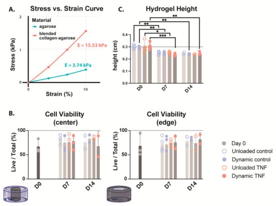 (A) Stress–strain curve comparing the stiffness of both 2% agarose (green) and blended 2% agarose and 2 mg/mL type I collagen hydrogels. Young’s modulus (E) is calculated as the slope of the stress–strain curve. n = 1 (B) Cell viability of CEP-seeded blended collagen–agarose hydrogels at the center and edge of the hydrogel. (C) Heights of the hydrogels for the duration of culture. * p < 0.05, ** p < 0.01, *** p < 0.001; n = 3–4.