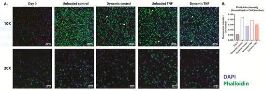Human CEP cells in unloaded control hydrogels maintained their rounded morphology in the blended collagen–agarose hydrogels throughout the experiment, as demonstrated by F-actin staining with phalloidin (Figure 2A). The actin cytoskeleton was enhanced after 7 and 14 days in comparison to the initial intensity at day 0 for all conditions (Figure 2B). Notably, unloaded hydrogels showed a higher phalloidin intensity relative to the number of cells in comparison to dynamically loaded hydrogels. While TNF did not appear to influence the intensity of actin staining, elongated fibers were found in several locations within the hydrogel. These elongated fibers were also present in the dynamically compressed control hydrogels but not in unloaded control hydrogels. However, a majority of cells retained their rounded morphology in all conditions.