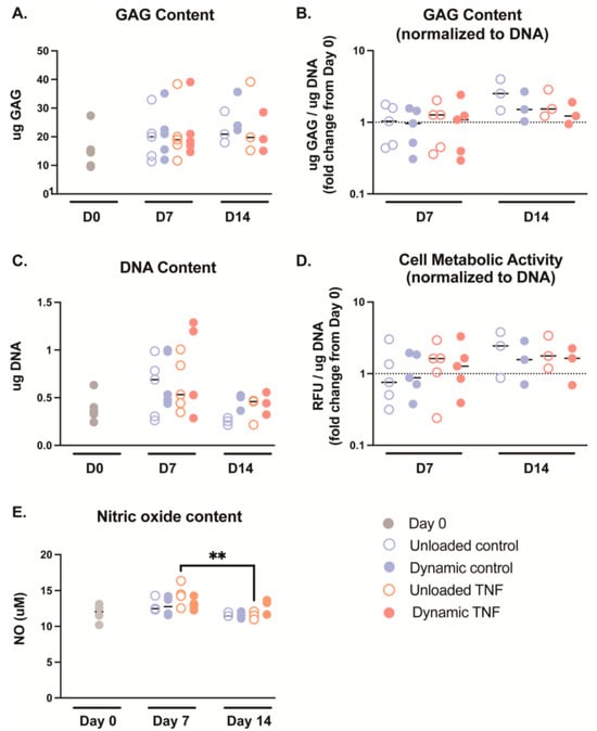 Median cell viability for each condition (between 69.7 and 86.9%) suggests high biocompatibility, although one donor exhibited lower cell viability below 50% after stimulation with TNF and dynamic compression. Additionally, cell proliferation occurred in the first 7 days of culture; however, it returned to initial numbers after 14 days, suggesting a time-dependent response to culture in blended collagen–agarose hydrogels. NO release into the media was also time-dependent, and it increased following TNF stimulation after one week but then returned to initial levels after two weeks’ culture. Despite no significant differences between cell viability and GAG content relative to initial values in any condition, hydrogel height was significantly decreased after 7 and 14 days. Moreover, cell height decreased approximately 0.5 mm in conditions after one week. Height did not decrease further after the second week, indicating that height changes occur early in culture and stabilize over time. Interestingly, the loss in height was measured to be the same in unloaded and dynamically compressed hydrogels, indicating the elasticity of the hydrogel. This height loss in the unloaded condition could be due to the weight of the chamber lids, which exerted ~5.1 Pa per hydrogel, impeding a true free swelling state. Nevertheless, the absence of any further height loss in dynamically loaded hydrogels suggests that the blended collagen–agarose hydrogels are able to retain their structure following strain deformations.