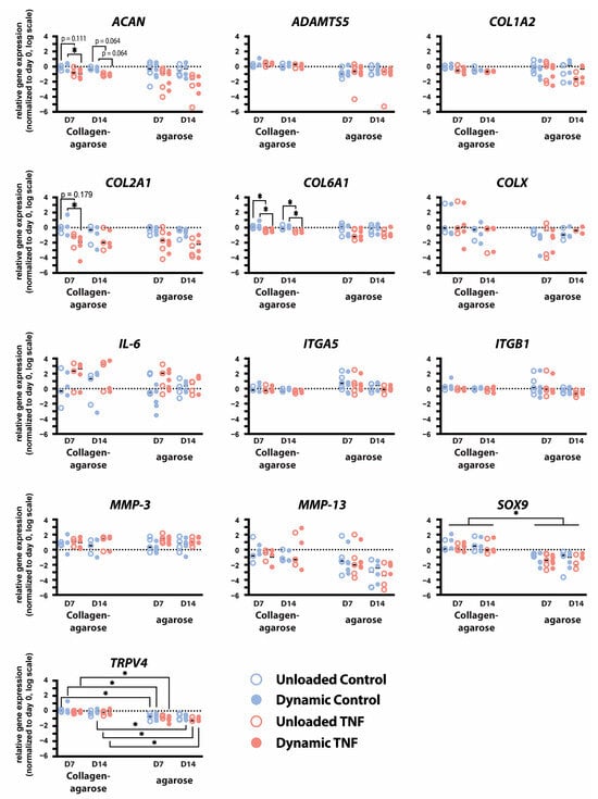 Relative gene expression of ACAN, ADAMTS5, COL1A2, COL2A1, COL6A1, COL10A1, IL-6, ITGA5, ITGB1, MMP-3, MMP-13, SOX9, and TRPV4 in human CEP cells cultured in either blended collagen–agarose hydrogels or in 2% agarose hydrogels for 7 and 14 days. Data is normalized to 18S and the corresponding day 0 expression. * p < 0.05; n = 3–5.