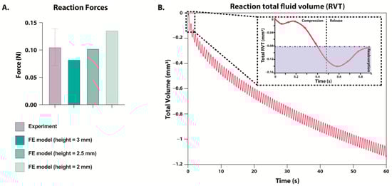 (A) Maximum reaction force during dynamic compression as measured experimentally (purple) or predicted in a FE model (green). FE model’s hydrogel height was simulated between 2 and 3 mm, but displacement remained at 0.21 mm. (B) Predicted reaction total fluid volume (RVT) measured during one minute of loading within the FE model. FE model’s hydrogel starting height was simulated to be 3 mm. The box in the top right corner zooms in on the change during one cycle of compression and release, and the area in blue is the fluid that has been reabsorbed before the next cycle of compression begins.