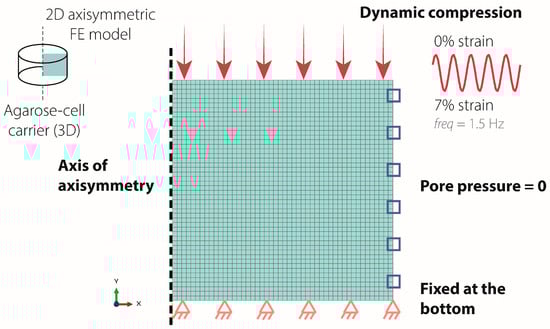 A 2D axisymmetric porohyperelastic, compressible, Neo-Hookean FE model of a blended collagen–agarose hydrogel was developed in Abaqus 2024 using experimental and literature-derived material properties to investigate mechanical forces within the hydrogel (Table 3). The literature-derived permeability, Poisson’s ratio, and porosity were taken from studies of 2–3% agarose hydrogels [,] as this data was not available for blended collagen–agarose hydrogels. Young’s modulus was measured in the lab as described above (Section 4.4. Stress–Strain Measurement). Boundary conditions were implemented to simulate unconfined axial compression (Figure 6). In brief, the bottom surface was fixed in the vertical direction but free to move radially. The pore pressure of the lateral surface was set to zero to allow free fluid influx and outflux. Sinusoidal dynamic compression, with a displacement to 0.21 mm at 1.5 Hz, was applied to the top surface. Three different hydrogel heights (3 mm, 2.5 mm, 2 mm) were evaluated to assess height changes measured over the duration of the experiment. Simulations were run for 60 s.