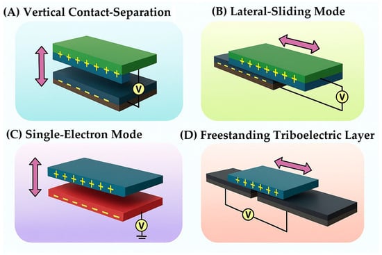 Upon contact between the freestanding layer and the electrodes, electrostatic induction facilitates the flow of charge carriers across the system. This interaction can occur through planar or rotational sliding, depending on the design of the electrodes and the motion of the freestanding layer []. In some configurations, the laterally aligned electrodes are replaced with vertically arranged ones, allowing the conductive freestanding layer to move between them. To prevent charge leakage in such cases, a dielectric layer is often introduced beneath the electrodes []. Notably, the FSTL mode can also function in a non-contact regime. Once the triboelectric surfaces are initially charged through contact, subsequent sliding is not strictly necessary. Even with sufficient separation, the freestanding layer can continue to induce charge transfer as it moves over the electrodes. This approach significantly reduces surface wear, thereby extending the operational lifetime of the device [].