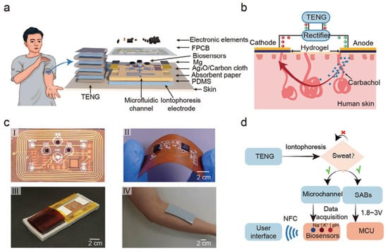 - Xu, G.; Huang, X.; Shi, R.; Yang, Y.; Wu, P.; Zhou, J.; He, X.; Li, J.; Zen, Y.; Jiao, Y.; et al. Triboelectric Nanogenerator Enabled Sweat Extraction and Power Activation for Sweat Monitoring. Adv. Funct. Mater. 2024, 34, 2310777. [Google Scholar] [CrossRef]