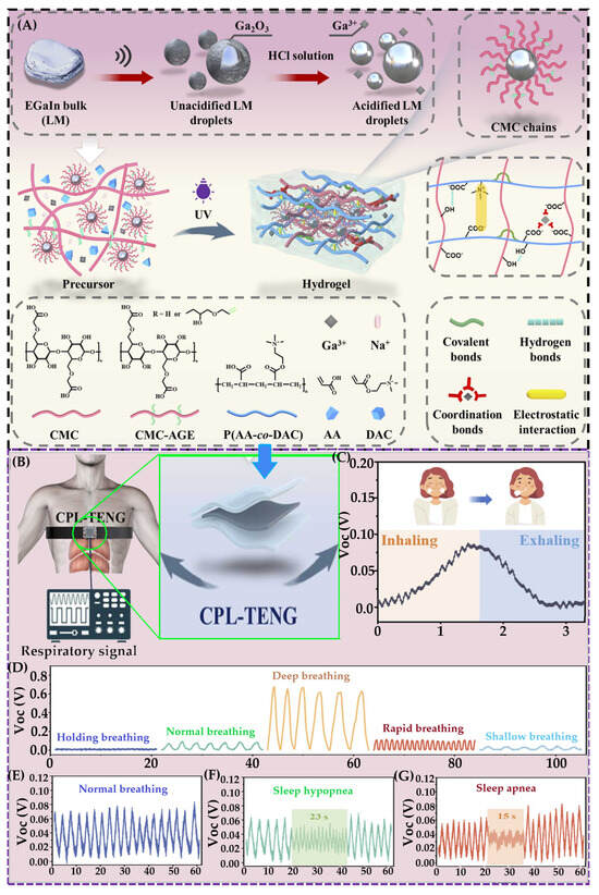 - Yang, Q.; Yu, M.; Zhang, H.; Li, N.; Du, J.; Xu, L.; Xu, J. Triboelectric nanogenerator based on well-dispersed and oxide-free liquid metal-doped conductive hydrogel as self-powered wearable sensor for respiratory and thyroid cartilage signal monitoring. Nano Energy 2025, 134, 110530. [Google Scholar] [CrossRef]