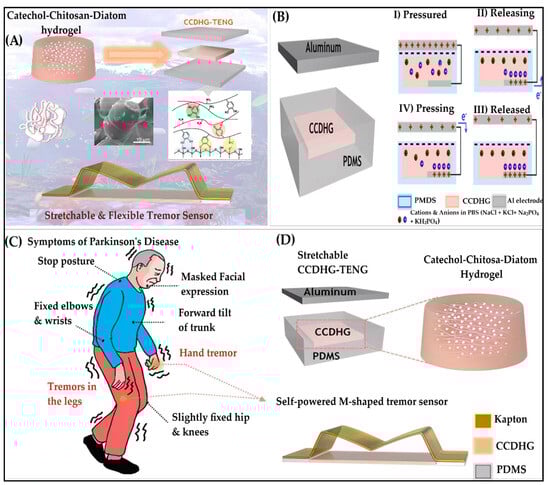 Composite gels are formed by integrating two or more distinct material types—typically organic and inorganic components—to achieve enhanced mechanical, electrical, optical, and environmental properties compared to single-component gels [,]. These gels exhibit superior mechanical strength and ductility, often achieved by incorporating inorganic nanoparticles. Kim et al. [] developed a catechol–chitosan–diatom hydrogel (CCDHG) for a wearable TENG (CCDHG-TENG), designed as an “M-type” tremor sensor. The term “M-type” refers to the M-shaped configuration of the Kapton film used in the sensor design, which contributes to enhanced mechanical adaptability and signal resolution. It achieved an open-circuit voltage of 110 V and a short-circuit current of 3.8 μA, enabling real-time monitoring of Parkinson’s disease symptoms using machine learning. Additionally, Bagchi et al. [] developed a hydrogel-based TENG encapsulated in an Ecoflex layer, capable of withstanding mechanical forces up to 45 N and maintaining tensile properties of 233%. The device delivered a power density of 1.68 W/m2 and ~26% energy conversion efficiency, along with rapid self-healing and long-term stability. Composite gels also benefit from enhanced conductivity through the inclusion of conductive materials like carbon nanotubes or polymers. Xiao et al. [] doped graphitic carbon nitride (g-C3N4) into a PVA hydrogel, producing a flexible and cost-effective electrode for TENGs. The resulting device reached a peak-to-peak open-circuit voltage of 80 V, significantly outperforming the pristine PVA hydrogel. The device delivered a power density of 1.68 W/m2 and ~26% energy conversion efficiency, along with rapid self-healing and long-term stability. Specifically, the dehydrated g-C3N4/PVA hydrogel demonstrated recovery of up to 80% of its original performance. Furthermore, a self-contact electrification (SCE) aerogel was engineered by incorporating a polyimide (SF-PI) containing fluoro and sulfone groups onto a graphene aerogel (GA) []. This structure enabled charge redistribution during deformation, generating electricity through internal contact electrification. The SCE-TENG could distinguish materials based on contact-induced voltage differences, paving the way for soft robotics and intelligent self-powered sensors.