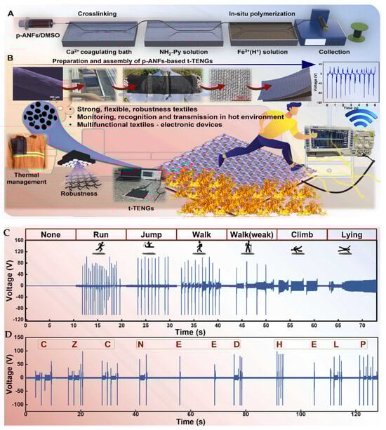 - Chen, Z.; Zhou, C.; Xia, W.; Yin, X.; Wang, Z.; Fu, X.; Liu, D.; Lv, J.; Liu, R.; Peng, Z.; et al. Strong, flexible and robust aramid nanofibers-based textile-triboelectric nanogenerators for high temperature escape monitoring and multifunctional applications. Nano Energy 2024, 123, 109359. [Google Scholar] [CrossRef]