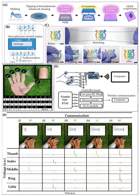 Despite notable progress, several challenges persist. In particular, the environmental stability of hydrogels remains a concern, as their tendency to dehydrate significantly compromises long-term performance []. Signal consistency under dynamic mechanical conditions and seamless integration with electronic and data-processing systems also require further optimization. Moreover, scalability and cost-effectiveness are critical for commercial translation [].