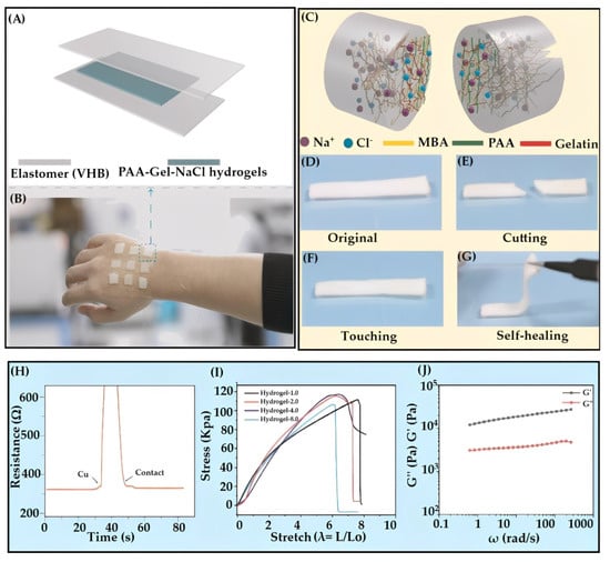 - Wang, M.; Li, L.; Zhang, T. Hysteresis-free, fatigue-resistant and self-adhesive conductive hydrogel electronics towards multimodal wearable application. Nano Energy 2024, 126, 109586. [Google Scholar] [CrossRef]