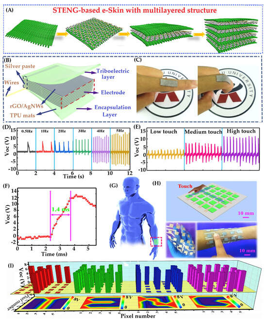 The rapid advancement of wearable electronics, biomedical diagnostics, and environmental monitoring technologies has created an urgent demand for flexible, lightweight, and self-powered sensing systems [,,,,,,,]. Conventional sensors, which rely on external power sources such as batteries or capacitors, face limitations in terms of bulkiness, finite energy capacity, and environmental sustainability []. These constraints hinder the development of autonomous and long-lasting sensing platforms, particularly in dynamic and mobile applications. In response, TENGs have emerged as a promising solution, capable of converting ambient mechanical energy into electrical signals through contact electrification and electrostatic induction. TENGs have emerged as a promising technology for harvesting ambient mechanical energy, converting it into electrical signals through contact electrification and electrostatic induction [,,,,,,,,].