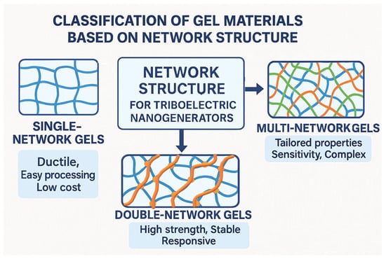Gel materials used in TENGs can be classified based on the number of polymer networks they contain. These include single-network, double-network, and multi-network gels, each offering distinct structural and functional advantages (Scheme 1) [,,].