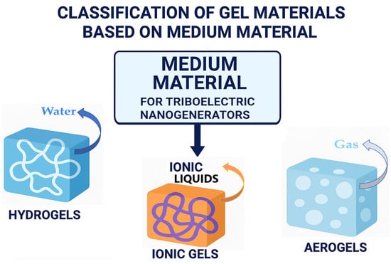 To overcome these limitations, recent studies have explored the incorporation of polymer gels—such as hydrogels, ionogels, and organogels—into TENG architectures, offering improved flexibility, biocompatibility, and adaptability to complex surfaces [,,,,,,,]. Gel-based materials uniquely combine softness, stretchability, tunable conductivity, and biocompatibility, positioning them as ideal candidates for the development of next-generation flexible and wearable triboelectric nanogenerators []. Gels consist of three-dimensional polymer networks swollen with aqueous or ionic media, and can be tailored through various synthesis approaches, including physical or chemical crosslinking, solvent exchange, and the incorporation of conductive fillers such as carbon nanotubes, graphene, and MXenes [,,].