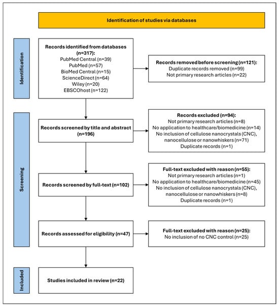 A literature search was performed in November 2024 to identify English-language (and translated), peer-reviewed primary research articles that were indexed in PubMed Central, PubMed, BioMed Central, ScienceDirect, Wiley, and EBSCOhost databases. The Preferred Reporting Items for Systematic Reviews and Meta-Analyses (PRISMA) guidelines were followed when developing the search protocol. The databases were systematically searched using the following Boolean search terms: (Functional properties OR properties) AND hydrogel* AND (“cellulose nanocrystals” OR nanocellulose OR nanowhiskers) AND (healthcare OR “healthcare applications” OR biomedicine OR biomedical OR “biomedical applications”). It should be noted that there were some variations in the search approach in the selected databases to suit the search platform.