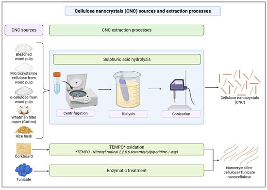 Extraction processes of cellulose nanocrystals (CNC) from various sources (created by D.M. Seneviratne using BioRender (https://app.biorender.com/ accessed on 27 April 2025).