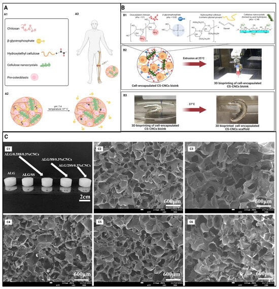 (A) Schematic illustration of an injectable hydrogel system. (A1) Formulation components for an injectable hydrogel system. (A2) Crosslinking mechanisms under physiological conditions. (A3) Desired site of injection. Adapted from reference [43]. (B) Schematic illustration of the 3D bioprinting process. (B1) Bioink formulation consisting of CS, BGP, HEC, and CNCs seeded with cells. (B2) Cell-encapsulated bioink was loaded into 3D-bioprinter cartridges and bioprinted onto a cell-culture glass coverslip with cartridge temperature controlled at 25 °C. (B3) A 3D-bioprinted scaffold of a patient-derived knee meniscus using the CS–CNC placebo bioink. The bioprinted scaffold was spontaneously gelled on a glass printing plate by temperature stimulation at 37 °C. Part of the figure was reproduced from [45]. Adapted from reference [27]. (C) (C1) Physical images of ALG hydrogels, ALG/SS, ALG/0.5SS/0.3%CNCs, ALG/SS/0.3%CNCs, and ALG/2SS/0.3%CNCs composite hydrogels; SEM images of (C2) ALG hydrogels, (C3) ALG/SS, (C4) ALG/0.5SS/0.3%CNCs, (C5) ALG/SS/0.3%CNCs, and (C6) ALG/2SS/0.3%CNCs composite hydrogels. ALG/SS/CNCS, alginate/sericin/cellulose nanocrystalline; SEM, scanning electron microscope. Adapted from reference [29].