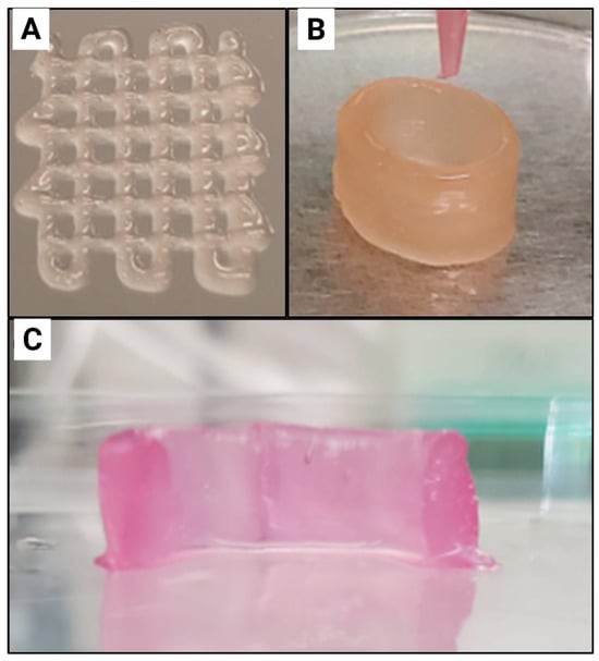 Bioprinting of mNG hydrogels. (A) a grid pattern and (B) a tubular construct (d = 20 mm, h = 15 mm, t = 3 mm). (C) The cross-section of the hydrogel after 7 days in culture shows robustness of the printed structure. Adapted from reference [36].