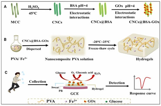The schematic illustration of the synthesis of (A) CNCs@BSA-GOx and (B) nanocomposite hydrogels. (C) Schematic diagram of the hydrogel applied to sweat glucose detection. Adapted from reference [24].