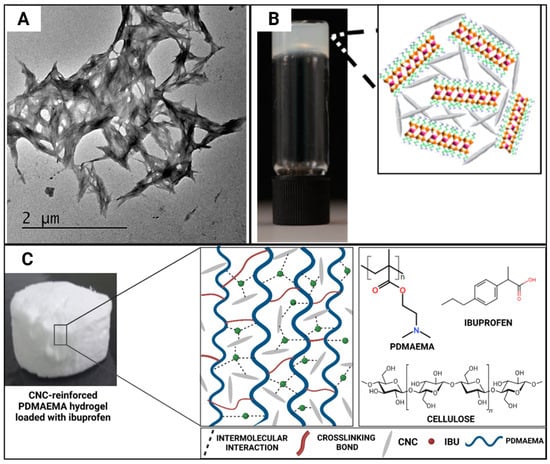 (A) Unstained transmission electron microscope (TEM) image of cellulose nanocrystal (CNC)-organoclay hydrogel; (B) photograph showing self-supported CNC:organoclay (1:0.13) colloidal nanocomposite hydrogel, inset showing schematic illustration of cross-linked network formed by non-covalent interactions between CNC (grey) and exfoliated organoclay sheets. Adapted from reference [32]. (C) Appearance of hydrogels post-freeze-drying and schematic representation of their hypothesised structural arrangement and ibuprofen entrapment through intermolecular interactions. The chemical structures of the polymer matrix (PDMAEMA—poly(2-(Dimethylamino)ethyl methacrylate)), nanofillers (cellulose nanocrystals—CNC), and drug (ibuprofen—IBU) are displayed on the right. Created using Biorender. Adapted from reference [40].
