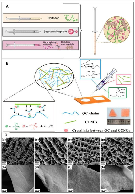 (A) Schematic illustration of polymer interactions within the hydrogel matrix. Adapted from reference [42]. (B) Schematic representation of hydrogel precursors and injectable QC/CCNC/β-GP nanocomposite hydrogels (Not Drawn to Scale). Adapted from reference [25]. (C) Scanning electron microscopy (SEM) images of the cross-section of (a,b) the pure QC/β-GP hydrogel and the hydrogels reinforced with (c,d) 1, (e,f) 1.5 and (g,h) 2.5 wt% of CCNCs. Adapted from reference [25].