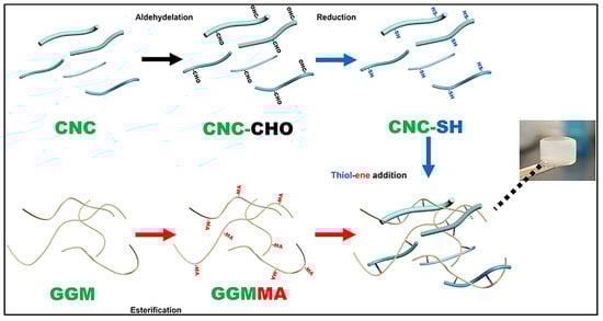 Illustration of hydrogel fabrication. CNCs were isolated from the MCC and oxidised to introduce aldehydes, followed by reductive amination to graft thiol (SH) moieties; galactoglucomannan (GGM) was isolated from the tree, and esterification was performed to introduce methacrylate (MA) moieties. Hydrogel was obtained through light-induced thiol-ene addition. Adapted from reference [23].