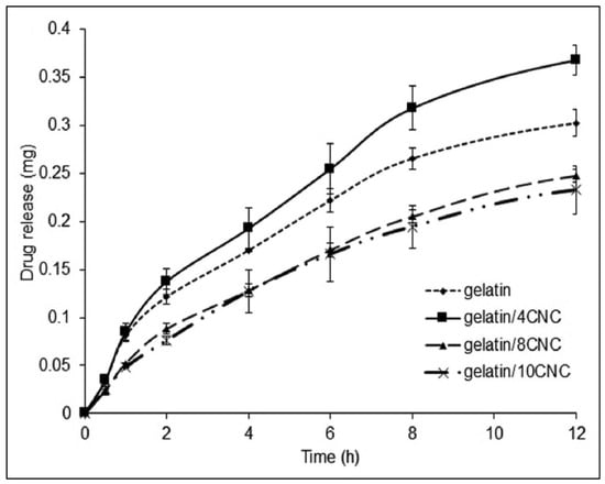 Ibuprofen aqueous solution (10 wt%) displayed a controlled release over 6 h, and a 10% slower release rate was displayed in CNC-incorporated hydrogels (Figure 10A,B), since this is dependent on both charge-mediated and diffusion-limited processes [32]. In another study where CNCs were incorporated at 4, 8, and 12% w/w concentrations (Figure 10C), the hydrogels gained weight instead of losing weight, and the authors stated that the presence of CNCs did not affect the stability of the hydrogels [40]. The incorporation of CNCs increases the drug loading capacity since it enhances the swelling capacity of the hydrogel, which was seen when ibuprofen (200 mg/mL) [40] was loaded.