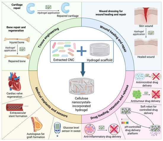 Development of a cellulose nanocrystal (CNC)-incorporated hydrogel for emerging biomedical applications (created by D.M. Seneviratne using BioRender (https://app.biorender.com/ accessed on 29 April 2025).