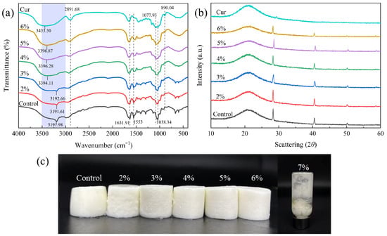 The intermolecular interactions of Cur/MP complexes were investigated by FTIR spectroscopy. As shown in Figure 1a, the characteristic bands of the samples at about 3000–3500 cm−1 corresponded to O–H or N–H stretching vibrations, while the absorption bands at 2990–2890 cm−1 were attributed to C–H stretching vibrations []. Typical protein bands were observed: the absorption band at 1680–1630 cm−1 corresponded to C–O stretching vibration (amide I band), the absorption band at 1560–1530 cm−1 corresponded to N–H vibration (amide II band), and the absorption band at 1450–1240 cm−1 corresponded to N-H deformation and C–H stretching vibration (amide III band) []. In addition, the absorption peak at 1038.34 cm−1 in the spectrum of MP represented C–O or C–C stretching vibration []. For Cur, the absorption peaks at 1077.93 cm−1 (C–O glycosidic bond) and 890.04 cm−1 (β-1, 3-D-glucan) were observed []. Notably, no new absorption peaks were observed in the FTIR spectra of Cur/MP complexes with different Cur concentrations compared to pure MP (Figure 1a). This suggested that no new functional groups were formed between Cur and MP molecules and that no covalent interactions occurred between the compounds. In the Cur/MP complexes profile, the signals of the unique absorption peaks of Cur (3433 cm−1, 2891.68 cm−1, 1077.93 cm−1 and 890.04 cm−1) were intensified and the signals of the MP absorption peaks (3191.98 cm−1, 2989.77 cm−1, 1631.91 cm−1, 1553 cm−1 and 1038.34 cm−1) were diminished as the concentration of Cur was increased. The absorption bands of Cur/MP complexes gradually changed from being similar to pure MP (Cur ≤ 3%) to being similar to pure Cur (Cur > 3%), indicating that Cur gradually became the dominant component of the complexes, and intermolecular interactions were enhanced with the increase in Cur concentration. Blue shifts in hydroxyl absorption peaks of the Cur/MP complexes were observed in comparison to the spectrum of Cur and red shifts compared to the spectrum of MP []. These wavelength shifts confirmed hydrogen bonding between Cur and MP. Similar findings were found by Zhu et al. [] in a study of TGase and curdlan to improve the gel strength of surimi gels.