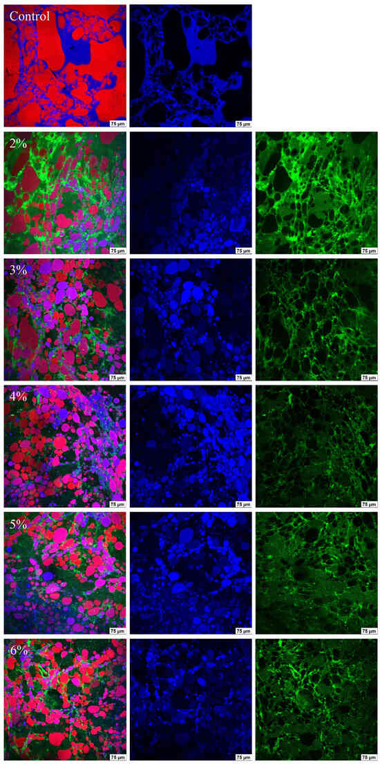 Transverse relaxation time (T2) can characterize the binding of hydrogen protons in samples and thus reflects the strength of water mobility in the sample. The T2 of emulsion gels was determined by low field nuclear magnetic resonance (LF-NMR) to analyze the distribution and migration of water. A shorter relaxation time represents a smaller degree of freedom for the hydrogen proton. Figure 4 shows the relaxation peaks of three different hydrogen proton signals for emulsion gel samples: the T21 (0.5–12 ms) was associated with water/oil tightly bound by the macromolecules, the T22 (12–900 ms) corresponded to immobilized water/oil in the emulsion gel network, and the T23 (>900 ms) represented free water/oil []. With the increase in Cur content, the relaxation times of T22 and T23 of Cur/MP emulsion gels were gradually shortened compared to the control group. In particular, the relaxation time of peaks in the emulsion gel samples did not exceed 1000 ms at Cur concentrations ≥5%, which was closely related to the Cur induced unique stability of MP emulsion gels. The results suggested that the addition of Cur to the MP emulsion gel system decreased the degree of freedom of hydrogen protons and enhanced the binding capacity to water/oil. To further analyze the water distribution in each experimental group, the relative contents of water in different states are shown in Table 2. A21, A22 and A23 represented the relaxation peak relative areas of T21, T22 and T23, respectively. The A21 of all groups had no significant difference (p > 0.5) and was much lower than the other relaxation peaks (not more than 1% of the total content), indicating that the content of Cur had no significant effect on the bound water/oil of MP emulsion gels. The addition of Cur resulted in a significant increase in A22 along with a significant decrease in A23 compared to the control (p < 0.5). The higher the concentration of Cur the higher the proportion of immobilized water in the system, and no free water was detected at higher concentrations of Cur (5–6%). These changes indicated that the addition of Cur resulted in the migration of free water to immobilized water in MP emulsion gels, which was consistent with the results of WHC. This may be because the dense gel network induced by Cur was helpful to improve the water retention of MP emulsion gels, a finding further supported by CLSM (Figure 5) and Cryo-SEM (Figure 6) images. Combined with the microstructural imaging results, it was demonstrated that Cur/MP emulsion gels formed a denser network, which increased capillary forces and thereby enhanced the retention of both water and oil. The Cur molecule was rich in hydroxyl groups capable of binding more free water through hydrogen bonding interactions. In addition, the complex network system formed by the interpenetration of Cur and MP networks also reduced the water/oil mobility [].