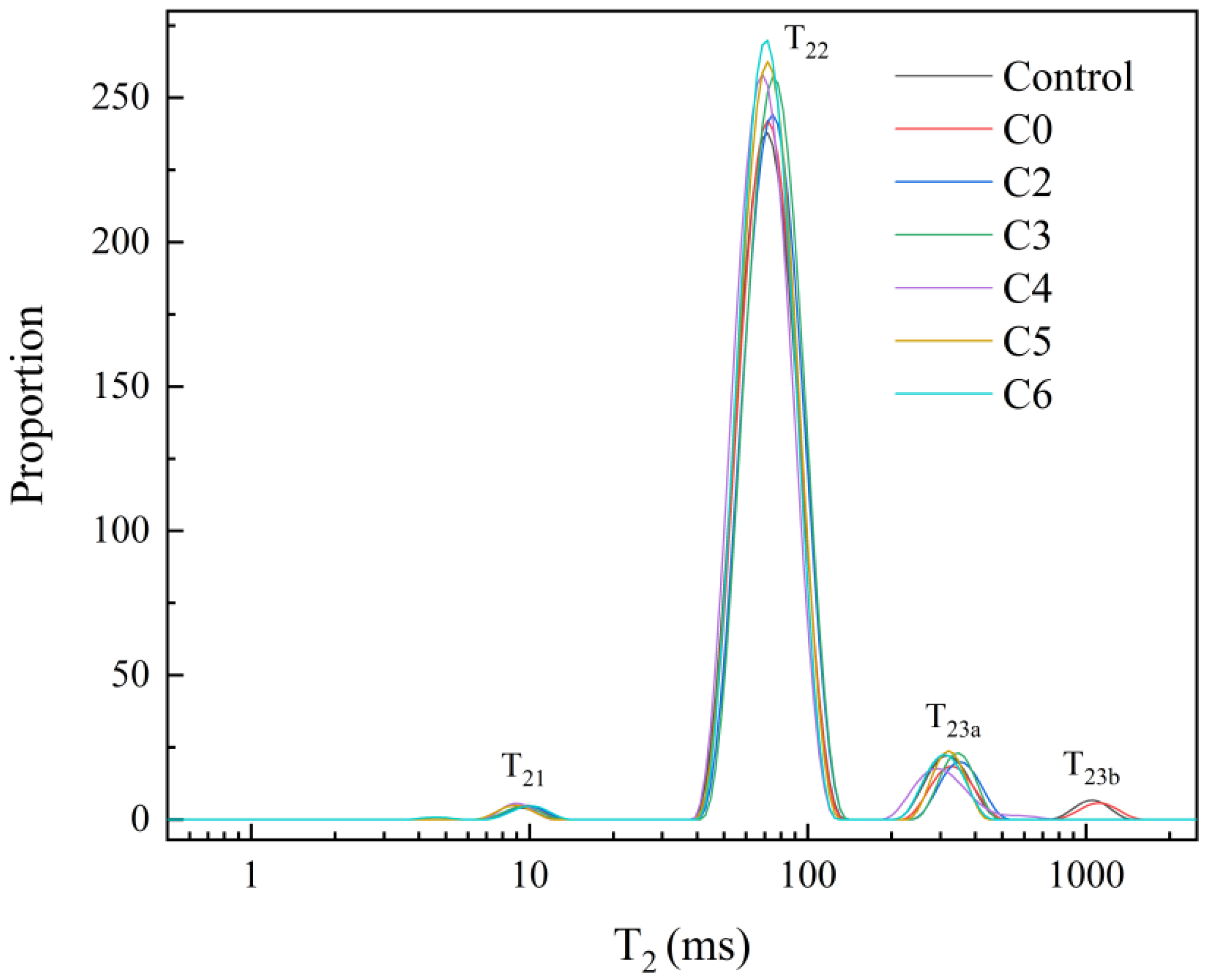 Samples | T2 Relaxation Peak Relative Area (%) | |||