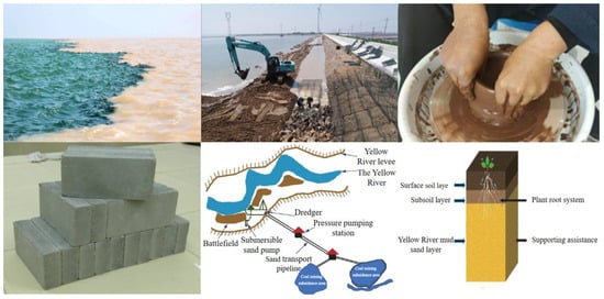 River sediment, generated in large volumes through dredging during urban and natural river management, often exceeds hundreds of millions of tons annually. However, most of it remains unused, occupying land and posing environmental risks such as heavy metal leaching [,,]. Compositionally, river sediments contain fine particles, clay minerals, and reactive silica–alumina components, showing similarities with traditional concrete materials in terms of gradation and mineralogy [,,]. This has prompted interest in their use as fine aggregates, partial cement replacements, or auxiliary admixtures, offering a pathway for transforming waste into a resource and aligning environmental governance with material recycling goals [,]. The existing literature confirms that using sediments in ternary cementitious systems is a mature and promising research direction. Several studies have successfully applied sediments in ternary blends, showing improved mechanical properties and refined microstructures [,]. To date, various applications of river sediments have yielded promising results: modification into flood control materials []; use as pavement base and sub-base layers []; soil remediation and land reconstruction in low- and medium-yield sandy areas along the Yellow River, where optimized filling strategies have been developed [,,]; and production of recycled bricks [,], lightweight aggregates [], and ceramic granules [] (Figure 1).