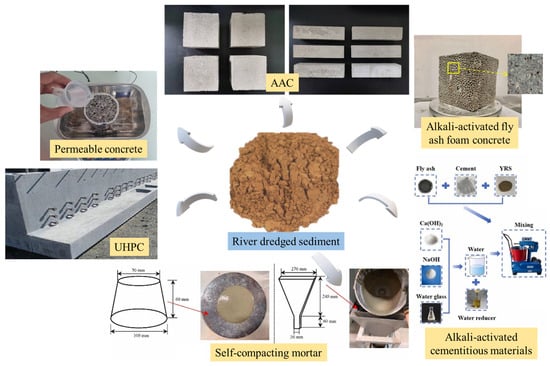 Application of river sediment in concrete (Permeable concrete [], AAC [], UHPC [], Alkali-activated fly ash foam concrete []; Self-compacting mortar []; Alkali-activated cementitious materials []).