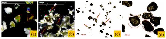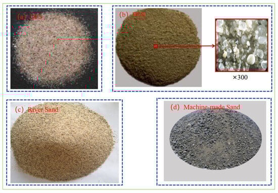 Comparison of material morphology of different sands. (a) Deposited fine sand (DFS) [], (b) fine-grained sediments (FGS) [], and its 300× micrograph []; (c) river sand; and (d) machine-made sand.