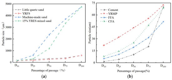 Particle size distribution of different types of sand/particles. (a) Particle size distribution of small quartz sand, deposited fine sand, mechanism sand, and a blend of 15% dosed Yellow River Fine Sand(YRFS) and mechanism sand; (b) particle size distribution of ordinary silicate cement [], low calcium fly ash (FFA) [], high calcium fly ash [] (CFA), and Yellow River Micro-Powder (YRMP) [].