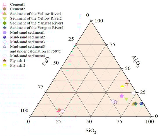 X-ray fluorescence analysis (Table 2) shows that the chemical composition of river sediments differs significantly from that of cement. Unlike cement, which is CaO-rich, sediments contain higher SiO2 and moderate Al2O3, resembling fly ash in composition [,]. As illustrated in Figure 5, sediments exhibit intermediate characteristics: their SiO2 and Al2O3 contents are higher than those of cement but lower than those of fly ash, while CaO content is lower than cement but higher than fly ash. Comparison of aggregate composition in Table 2 with ASTM C618 shows that the total SiO2, Al2O3, and Fe2O3 in most sediments exceeds 70%, meeting the minimum requirement for type N pozzolan in ASTM C618. This “medium silica–alumina with moderate calcium” profile indicates potential pozzolanic activity and Ca-supplement capacity, making sediments suitable as supplementary cementitious materials, especially for partial cement replacement or use with activators in low-carbon concrete.